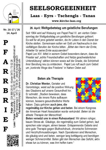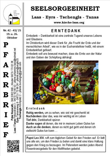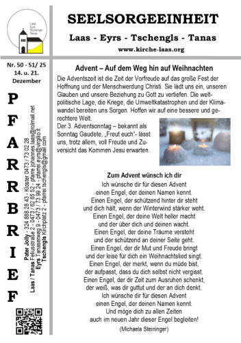Der Pfarrbrief ist das offizielle Mitteilungsblatt der Pfarreien in der Seelsorgeeinheit Laas.Seit dem Mediensonntag, dem 29. Jänner 2017, erscheint der Pfarrbrief mit der Gottesdienstordnung aller 4 Pfarreien Laas, Tanas, Tschengls und Eyrs, sowie weitere Mitteilungen aus den Pfarreien auf der Homepage.