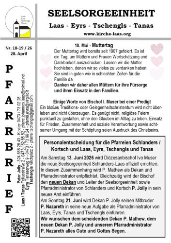 Der Pfarrbrief ist das offizielle Mitteilungsblatt der Pfarreien in der Seelsorgeeinheit Laas.Seit dem Mediensonntag, dem 29. Jänner 2017, erscheint der Pfarrbrief mit der Gottesdienstordnung aller 4 Pfarreien Laas, Tanas, Tschengls und Eyrs, sowie weitere Mitteilungen aus den Pfarreien auf der Homepage.